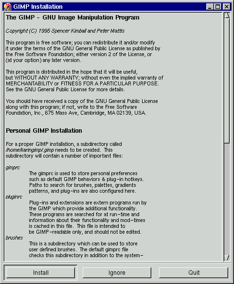 You can of course install gimp in different directories. To do so, read the INSTALL file and apply the command line options specified in the INSTALL file. Now you can jump to the first section in this chapter and read about how to install the personal gimp files.