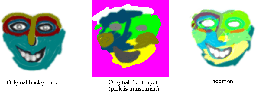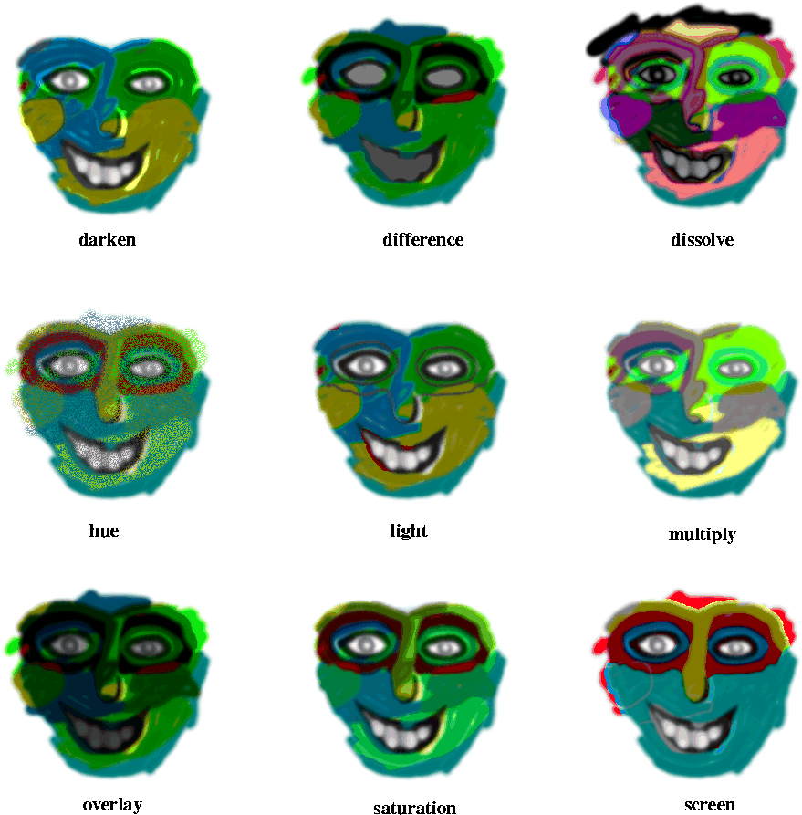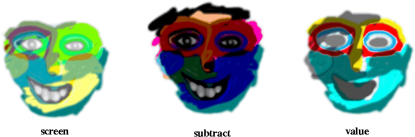 Difference Mode In this mode no foreground color will ever replace the background. Foreground colors, however have a dramatic effect on background pixels. Black FG pixels have no effect though, they are transparant, but as color gets brighter the effect increases, white being the most powerful difference color. What Difference mode does, is to evaluate corresponding pixels in both FG and BG and change the image accordingly. Now, if we're talking of grayscale foreground pixels, this is easy. If the foreground pixel is brighter than the one in the BG layer, the background pixel gets inverted. If it's darker it keeps its color, but a greyish cast is added to it - the darker the grayscale pixel, the weaker this shade of gray gets. If the FG pixels are colored, the result is different. Now the foreground pixel is inverted instead of the background one. Then this inverted color is added to the background as in Multiply (colored glass or CMYK-blends).