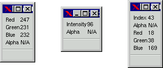 A small information box informs you of the RGB- and Alpha values of your chosen color. Alpha N/A means that your image contains no Alpha channel. (For more information on Alpha Channels read chapter 12). For a Grayscale image the information box displays an Intensity value ranging from 0 to 255, where 0 means black and 255 is white. An indexed image also has an index number for the specific color. Note that the Alpha value of an indexed image is either 0 or 255, there's nothing in between.