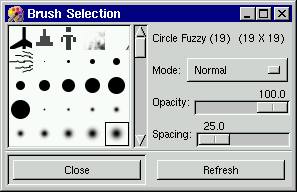 It belongs not only to Pencil and Paintbrush, but also to the Eraser, Airbrush, Clone tool and Convolver. You'll find the Brushes in the File/Dialogs menu in top of the Tool box, or in the Dialogs item in the menu you get from right clicking in you image. You'll find a variety of brushes. Note that brushes may have any shape! Besides the "Mode" and "Opacity" options there is a Spacing option where the brush stroke can be decomposed to a line of individual brush shaped objects. If you like, you can make you own brushes and add them to the Brush Selection dialog. You can also see chapter X.