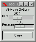 It creates soft, semi-transparent spray strokes. There are two options in the Options dialog - Rate and Pressure.
