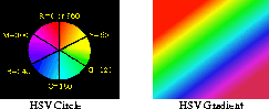 Besides the standard RGB option in Blend there is also the "FG to BG (HSV)" option, where HSV stands for Hue, Saturation and Value. HSV is a color model based on a 360 degree spectrum circle. This means that a gradient using HSV will not simply make a transition from red FG to blue BG by shades of violet. HSV starts with red, and follows the color circle clockwise with yellow, green and cyan until it reaches blue. The gradient will go clockwise (CW) if FG is in the right part of the semi circle, CCW if it's in the left part.