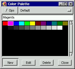 When you find the color you want, click in the "New" button, and a new color square is created in the palette. You can name and save your new palette, and you can edit or delete colors. To use colors in a palette, you don't need to select them to the foreground color square with the picker, just click at a new color with whatever paint tool you're using at the time. More about palettes in chapter X