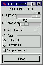 In a feathered selection, the bucket will make a soft concentrical fill, which can be made more intensely filled if you click several times (you can even use different colors, they 'll blend softly into each other in an opalescent effect). You also have a "Fill Opacity" option, which determines how transparent you want the fill to be. There is also a "Mode" option (read more on Modes in chapter x), and a "Sample Merged" option. Sample Merged means that the Bucket fill reacts to the full composite image, and not just the active layer (but it will only fill in the active layer). The "Pattern Fill" button enables you to use the "Pattern Dialog" where you can choose to fill your selection with a pattern instead of a color.