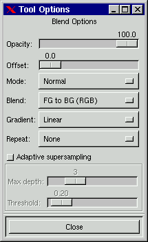 Finally, the "Adaptive Supersampling" - an option which slightly improves the smoothness of the blend by adding a few new intermediate colors. The effect is quite marginal, though, unless in very small selections (especially when using shapeburst), with a gradient from the editor. More about the editor in chapter X.