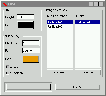 Numbering lets you specify a start number on the roll, and the Font (warning! - you have to have the font installed), color is the number color in your film. Both the color on the film itself (usually black though) and the color of the numbers can be changed by clicking on them. Check the "at top" and "at bottom" if you want numbers there, otherwise uncheck.