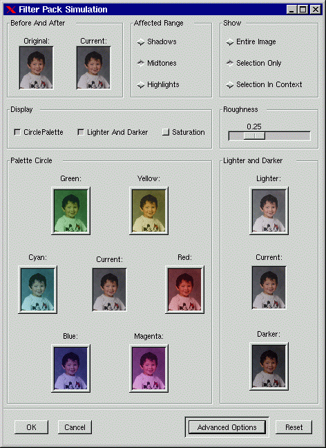 This is a real darkroom tool, and you can do most adjustments that you could do in a real lab. First decide what brightness value you want to affect, Shadows, Midtones, or Highlights. The Show Art is for preview. If you use a selection, you can press Selection Only to only preview the selection. Display decides what kind of values you are interested of changing, and therefore want to have a view of. The Palette Circle lets you change the color of the image. If you want your image to look a bit bluer, just press the blue preview. Lighter and Darker lets you change the amount of light in the image. Saturation (not in the screen dump because of the size) lets you change how colorful you want your image to be. Roughness refers to how much you want to alter your image. A higher value will allow you to change a lot, but on the other hand you will lose in precision.