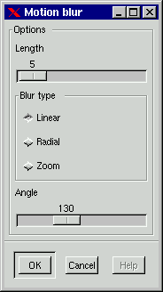 This plug-in imitates a snapshot of a moving object. If the blur type is Linear, it will look as if the object was moving beside you, and that the angle between you and the object was 90deg.The Angle is the direction of the faked motion, Length is the speed of the motion. More length means higher speed.