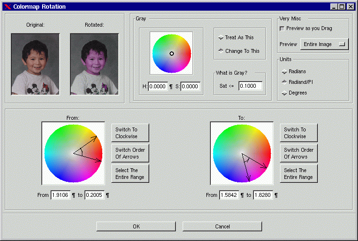 Example: If you in the "From:" circle select a range from cyan to magenta, and the type is counter clockwise, and in the "To:" field select the same range, but this type is clockwise, then all cyan colors will be rotated to magenta. If you press the "Switch Order.." button the range will be inverted.