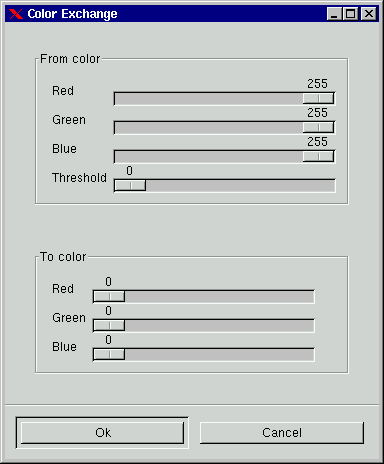 This filter is a lot like Color Rotate. Well, it is much simpler, but it is also faster and slimmer. You define the color to exchange in the upper field by setting the slide for each RGB channel, and a threshold fuzziness like in Select by Color. A tip is to have a color dialog up so you can see what color you are choosing. In the lower field you select the color you want to exchange to.