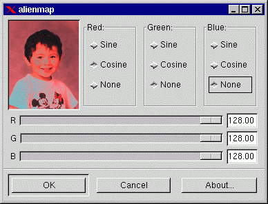 This filter applies trigonometrical functions on each of your RGB channels. Let's take the "Red channel" and see what it we can do with it. First let Green and Blue have "None" (linear) check. If you now check "Cosine", the image will get a lot redder. Why? As you can see in Fig X, cos will boost the "low" red values, that's what makes the difference, because even the tiniest little redness in a pixel will get a lot redder, the parts that already are quite red will also be boosted, but the parts with middle value for red are subdued. The latter will not really be as noticed as the boost in low values, because you already saw that they were red. If you check "Sine" you will notice that it will get a lot less redder, that is because Sine subdues the "low" red values and boosts the already "high" red values. As with Cos it's a lot easier to detect when a low value is altered. If you haven't checked "None", you can also set the intensity of each channel.