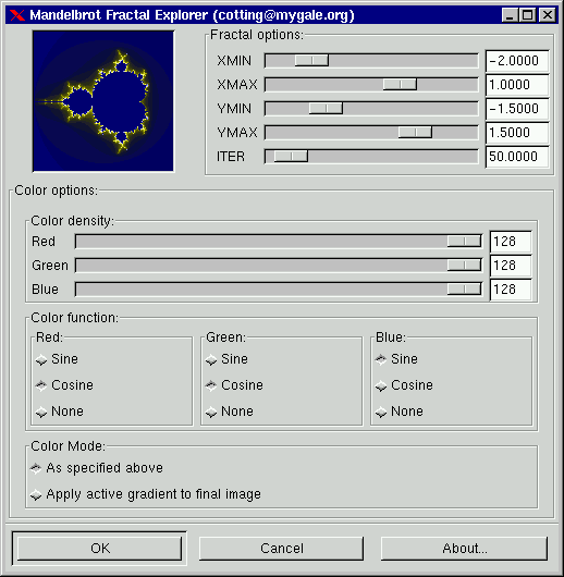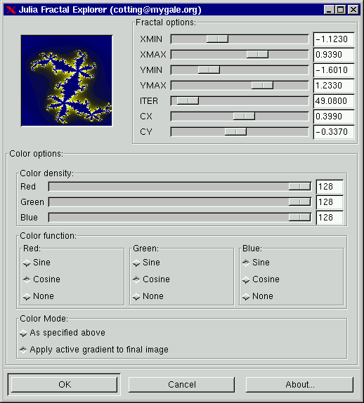 Color options: In a fractal you have three parts. An outer part, an inner part and the "fractal" between them. The Sine function controls the color of the inner and outer parts, while the Cosine function controls the "fractal" part. "None" means that you don't want a particular RGB color in your fractal. You can by checking and unchecking the three color functions choose what color you want for the different parts of your fractal. You can also set the density of color with the slides in "Color density". This makes it possible to set any color you want to your fractal.