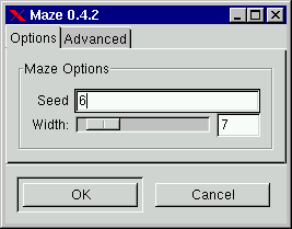 Generates a maze. You can specify random seed and what size the walls will have in pixels. If you call this filter again with Alt-F, the random seed will be different, and you will end up with a different maze. This is quite good because you can then call it again and again until you find a maze that fits your purposes.