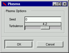 Plasma generates a colorful plasma cloud, which can be used for textures etc... You can control the turbulence in the plasma cloud. High values gives a hard and cold feeling to the cloud, low values give you a soft and warm feeling to the cloud. You can also set what random seed you want for your plasma cloud.