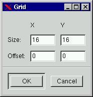 Grid: Controls the support grids in your gfig drawing. You can set the grid size in X*X pixles (if you have rect in the option tabfolder selected) with the grid spacing slide. You can also set if you want to display the grids and if you want your objects to snap to grid. If you have drawn objects without snap and then turn it on, the objects will snap at one end only. If you move all your objects with snap enabled, an invisible middle point will be calculated and that point will snap to the grid system.