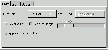 Paint: "Draw on" lets you choose where you want your drawing to end up. "original" paints the drawing on the original image. "New" creates a new layer where the drawing will be painted. "Multiple" creates a new layer for each object in your drawing. If you choose to draw to New or Multiple, you can also set what type of background you want in the new layer. There are four options: Transparant, Background (fills the background in the new layer with the current background color in the toolbox), White and Copy which copies the original image to the new layer, if you choose multiple, the previous layer will be copied to the new layer.