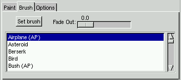 Brush: In this tab folder you can set what kind of brush you want to paint with. A tip is to bring up the "Select brush dialog" so you can preview the brushes, and also set the spacing of the brush, otherwise gfig will use the default spacing of the brush you select. To select a brush, highlight it and press "Set brush". Fade out controls after how many pixels the stroke will fade out, if it's set to 0.0, no fading will appear.