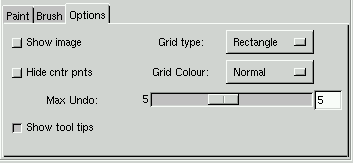 Options: Here you can set various options, like if you want the image to appear in the preview drawing area, if you want to hide the centre point in circles/ellipses/polygons, if you want tool tips, how many levels of undo you want, the grid color of your grid system and whether you want your grid system to be rectangular or circular(polar).
