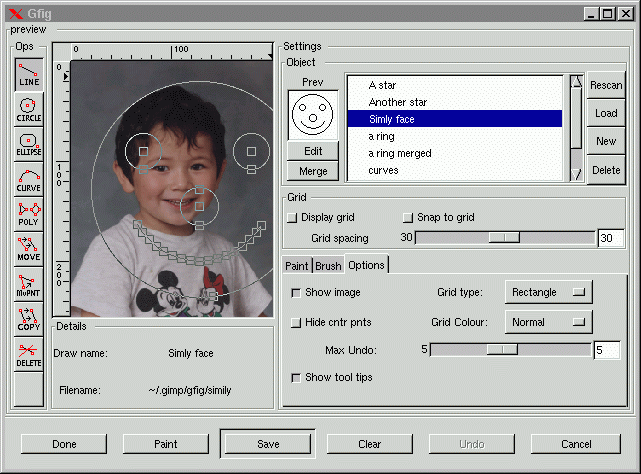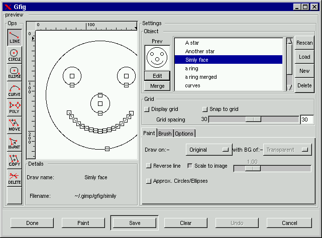 There's also a command bar at the bottom of Gfig . "Done" is for when you want to exit gfig after you're done with it. "Paint" paints your gfig drawing into your Gimp image according to your settings. "Save" saves a gfig drawing. "Clear" erases your drawing area. "Undo" will undo your last operation. "Cancel" lets you exit Gfig, and drop all that you have done.