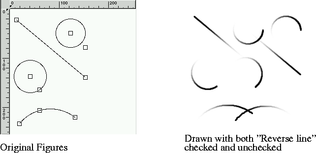 Reverse line: With this option you can control the direction of brush strokes. Normally, the "rendering" of your stroke goes from the first control point in your line to the last one.. If you set brush fade out to 20 in the brush tab folder, the stroke will fade out after 20 pixels (counted frome the first control point). If you check "Reverse line" it will fade out frome the last control point instead of the first. This option works with lines, curves and polygons. When it come to polygons, fading goes clockwise frome the "first" control point, if reverse line is unchecked.