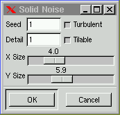 This is a great texture maker. X and Y size control texture size in X and Y direction. "Seed" is the random seed you want in your noise. "Detail" controls the amount of detail in the noise, higher values gives you higher level of detail and the noise seems to be made of small particles, which makes the noise feel "hard", a low value makes noise more soft. If you check "Turbulent" you'll get a noise which looks much like oil on water. With a low value of detail, it makes small turbulences in every detail of the noise. If you check "tileable" you'll get a noise which can be used as tiles, e.g you can use it as a background in a HTML page, and the tile edges will be invisible.