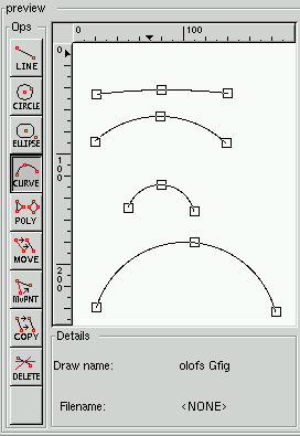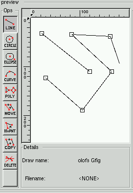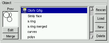 If you want to rename your drawing, simply double click on the name. If you right click on a name you'll get a menu where you can "Save", "Save as", "Copy" and "Edit" the drawing. To "Edit" a drawing, choose the name and either right click and select "edit" or press the "Edit" button. If you got some gfig drawings from internet or from a friend, you can copy them to the gfig directory (~/.gimp/gfig), press Rescan and they will appear in the name list. If you want to load a drawing outside of your gfig directory, press Load. This brings up an ordinary open file dialog where you can choose your gfig drawing. You can browse your drawings by highlighting them, and look at them in the "Prev" window. "Delete" pops up a dialog asking you if you want to delete the drawing, both the file and the name in the browser.