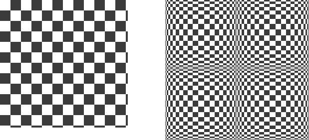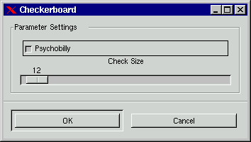 The Size slide controls the size of the checkers in pixels (X*Y pixels). If you choose to check "Psychobilly", you'll get pouting checkerbords... see pict 2. Size now represents the biggest tile in your checkerboard. E.g. say that your tile size is 4, then the middle tile (which is always the biggest tile) will be 4x4, and each Psychobilly tile will be 16x16 (because 4x4=16). The tile size follows the following algoritm 1,2,3,4...."tile size" ......4,3,2,1,