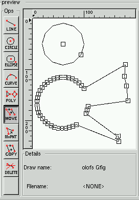 The Preview area: In "Ops" you'll find the drawing tools with which you can draw, delete, move, edit, and copy objects.