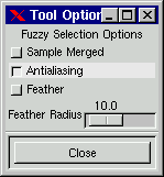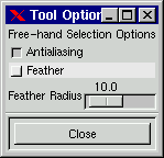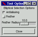 The options for the Bezier tool are Antialiasing and Feather. Read more about it in the section on Rectangular and Elliptical selection.