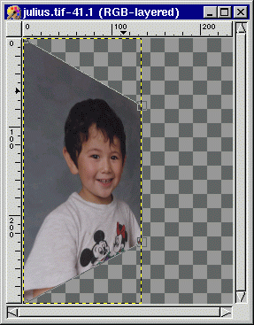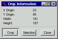 Press the crop button in the dialog box or click inside the markings, and whatever's inside of the cropmark will be your new image. The Crop Information dialog box informs you of the crop placement in x-y origin and width/height in pixels. The cropmark can be placed very accurately, you can move it (lower left or upper right corner) or resize it (opposite corners). It appears very clearly against the rulers, and you can use "nudge" (see Moving Selections) and "Snap to Guides" to help you further. Another option is to click the "Selection" button in the dialog box. This will automatically place the cropmark as close as possible to your selection.