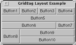 以下の図は、GridBagLayout によって管理される 10 個のコンポーネント (すべてボタン) を示します。