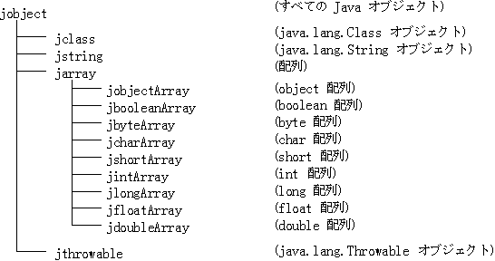 typedef jobject jclass;C++ では、JNI はダミークラスのセットを導入して、サブタイプ関係を強制します。たとえば、次のようになります。
