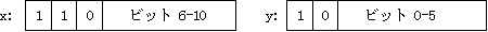 このバイトは、値 ((x&0x1f)<<6)+(y&0x3f) をもつ文字を表現します。