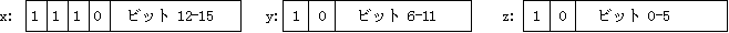 値 ((x&0xf)<<12)+(y&0x3f)<<6)+(z&0x3f) をもつ文字は、3バイトで表現されます。