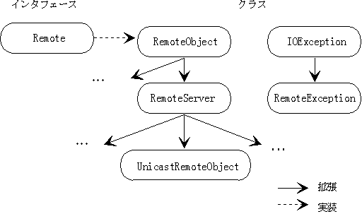 java.rmi.RemoteException クラスは RMI ランタイムがスローすることができる全ての例外のスーパークラスです。RMI システムを使うアプリケーションの安定性を保つために、リモートインタフェースで宣言される各メソッドは throws 節の中で