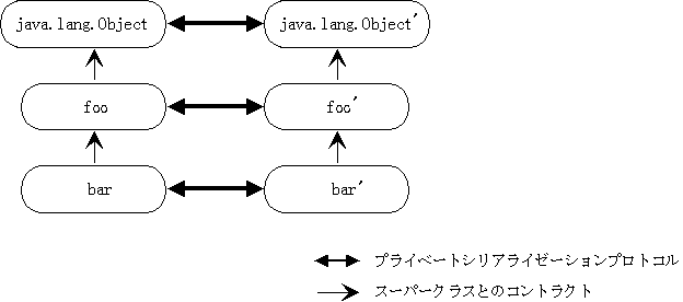 - ストリームの参照される各クラスは、それ自身、そのスーパー型、およびそのストリームに書き込まれた各 nonstatic と nontransient フィールドの型と名前を固有に識別する。これらのフィールドは、フィールド名によってソートされたプリミティブ型のものが最初にきて、次にフィールド名でソートされたオブジェクトフィールドが続く。