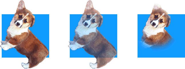 最初のイメージでは、すべてのピクセルが完全に不透明 (犬の体) または完全に透明 (背景) になっています。このような効果は、Web ページでよく使われます。2 番目のイメージでは、犬の体の全ピクセルを不透明ではない一定のアルファ値でレンダリングすることにより、青い背景が透けて見えます。3 番目のイメージでは、犬の顔の周囲のピクセルは完全に不透明 (アルファ = 1.0) ですが、顔から離れるに従って、ピクセルのアルファ値は徐々に小さくなっています。