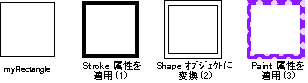 Stroke 属性を使う Graphics2D レンダリングメソッドは、draw、drawArc、drawLine、drawOval、drawPolygon、drawPolyline、drawRect、および drawRoundRect です。これらのメソッドを呼び出すと、指定した Shape の輪郭がレンダリングされます。Stroke 属性で線の特性が定義されて、Paint 属性でペンが描画する軌跡の色とパターンが定義されます。たとえば、draw(myRectangle) を呼び出すと、次の処理が行われます。