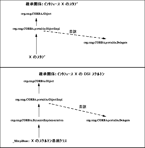 org.omg.CORBA.portable.ObjectImpl を継承します。このクラスを通して、is_a() などの共有機能がベンダー固有の実装に委譲されます。このモデルにより、ベンダーに依存する実装には幅広い選択肢が与えられる一方で、クライアント側やサーバでの「コードの肥大化」が緩和されます。DSI ベースのスケルトンはすべて、