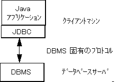 2 層モデルでは、Java アプレットまたはアプリケーションはデータベースと直接やり取りします。これには、アクセスしている特定のデータベース管理システムとやり取りできる JDBC ドライバが必要です。ユーザの SQL 文はデータベースに配信され、それらの文の結果がユーザに送り返されます。データベースは、ユーザがネットワーク経由で接続されているほかのマシンに置くことも可能です。これは、クライアント/サーバ構成と呼ばれ、ユーザのマシンがクライアント、データベースを持つマシンがサーバと呼ばれます。ネットワークは、たとえば社内で社員同士をつなぐイントラネットでも、インターネットでもかまいません。