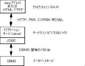 現在までのところ、中間層は通常 C または C++ のような高速なパフォーマンスを提供する言語で作成されてきました。しかし、Java バイトコードを効率的なマシン固有コードに翻訳する最適化コンパイラが導入されて、Java で中間層を実装することが現実的になっています。これは大きな進歩で、Java の堅牢さ、マルチスレッド処理、およびセキュリティ機能を利用できるようになります。JDBC は、Java の中間層からのデータベースアクセスを可能にするのに重要です。