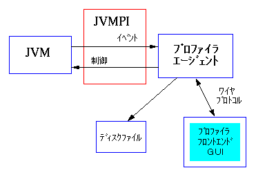 JVMPI は、Java Virtual Machine とプロセス中のプロファイラエージェントとの間の双方向の関数呼び出しインタフェースです。Virtual Machine は、プロファイラエージェントに、ヒープ割り当て、スレッドの開始などに対応するさまざまなイベントを通知します。一方、プロファイラエージェントは、JVMPI を使ってより多くの情報を制御、および要求します。たとえば、プロファイラエージェントは、プロファイラフロントエンドの必要に基づき、特定のイベント通知をオンまたはオフすることができます。